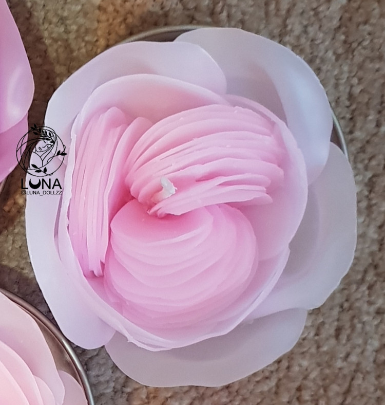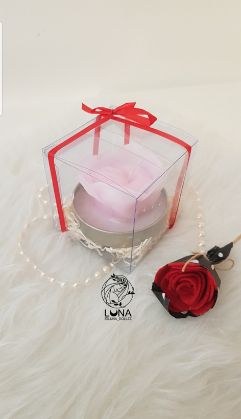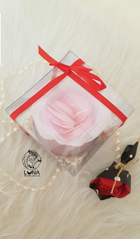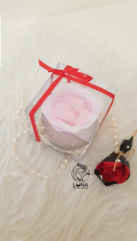 شمع گیفت داخل جعبه طلقی با گل پیچ رز صورتی
