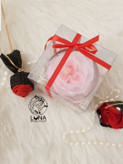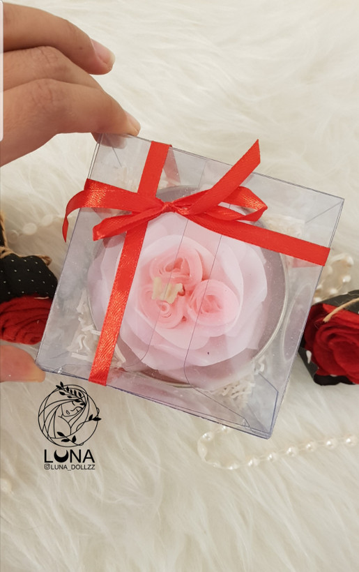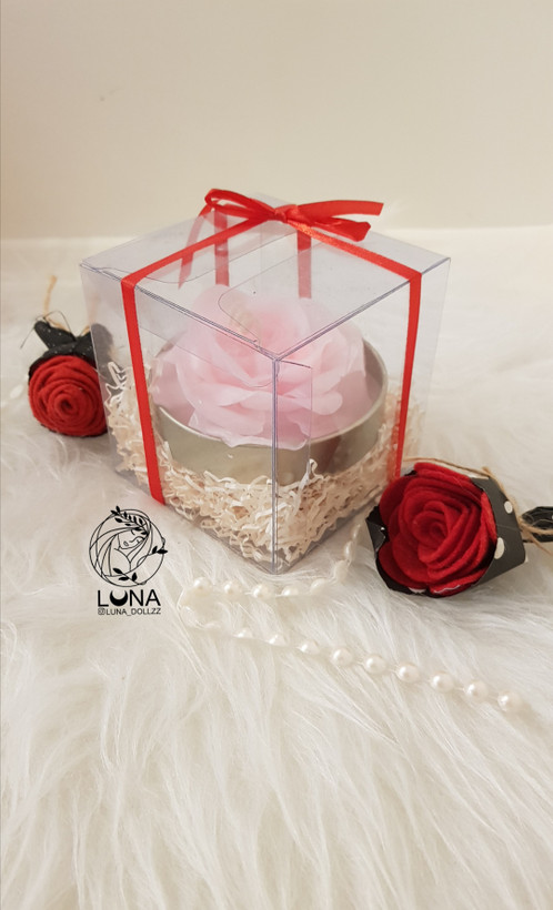شمع گیفت داخل جعبه طلقی با گل رز روسی گلبهی