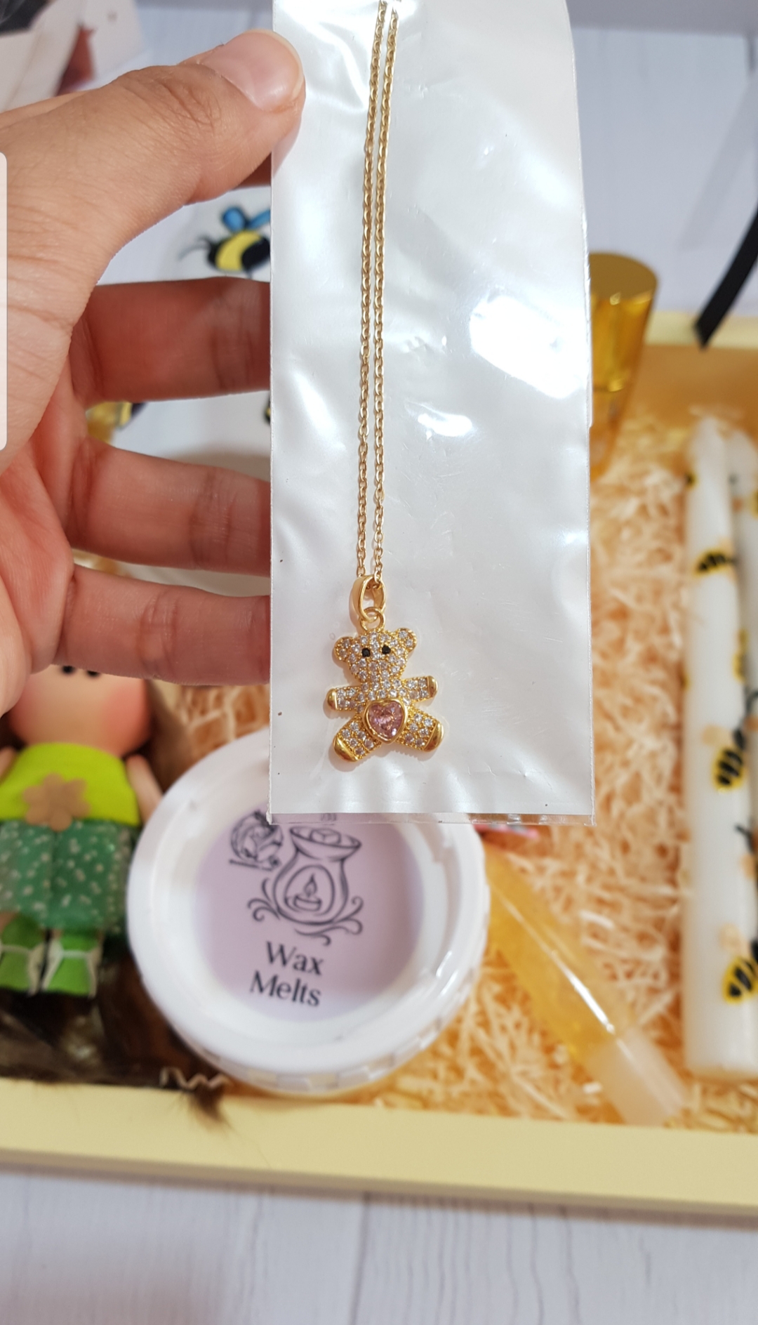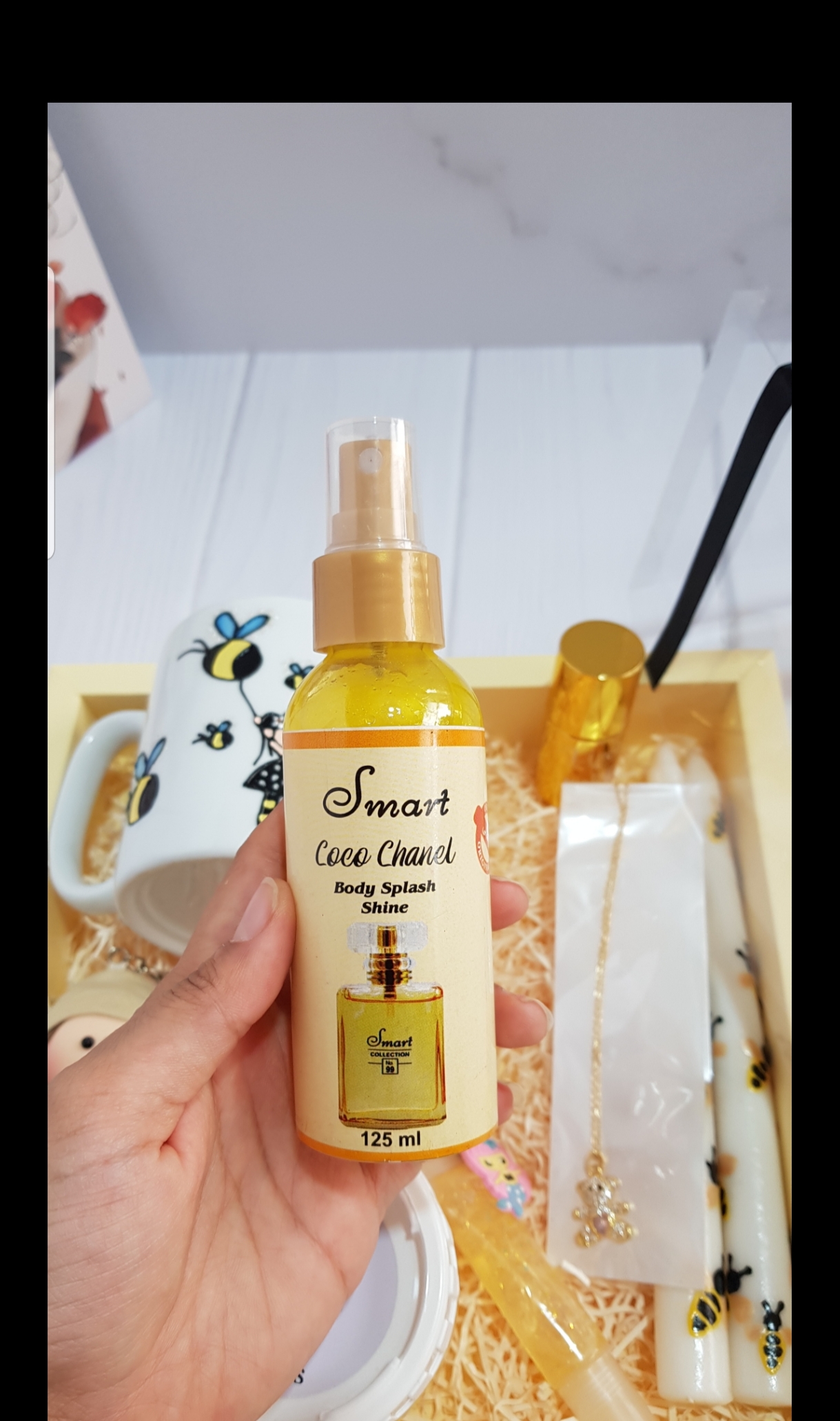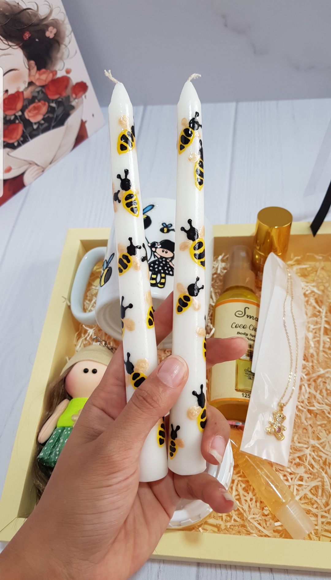 ماگ طرح ویترای زنبوری ، عروسک جاسوئیچی دستساز ۱۰سانتی، شمع قلمی ۲۰ سانتی که روش نقاشی شده باطرح بامزه زنبور، وکس ملت طرح های مختلف زنبور، لیپ بالم زرد، بادی اسپلش ۱۲۵میل، لاک آینه ای، گردنبند طلایی خرسی بسیار درخشانو زیبا
