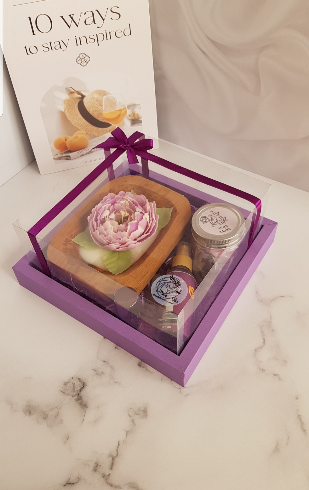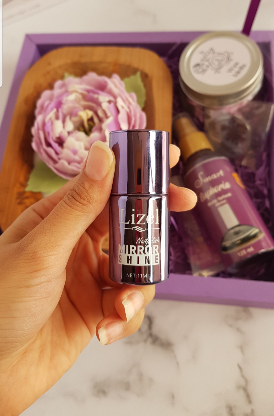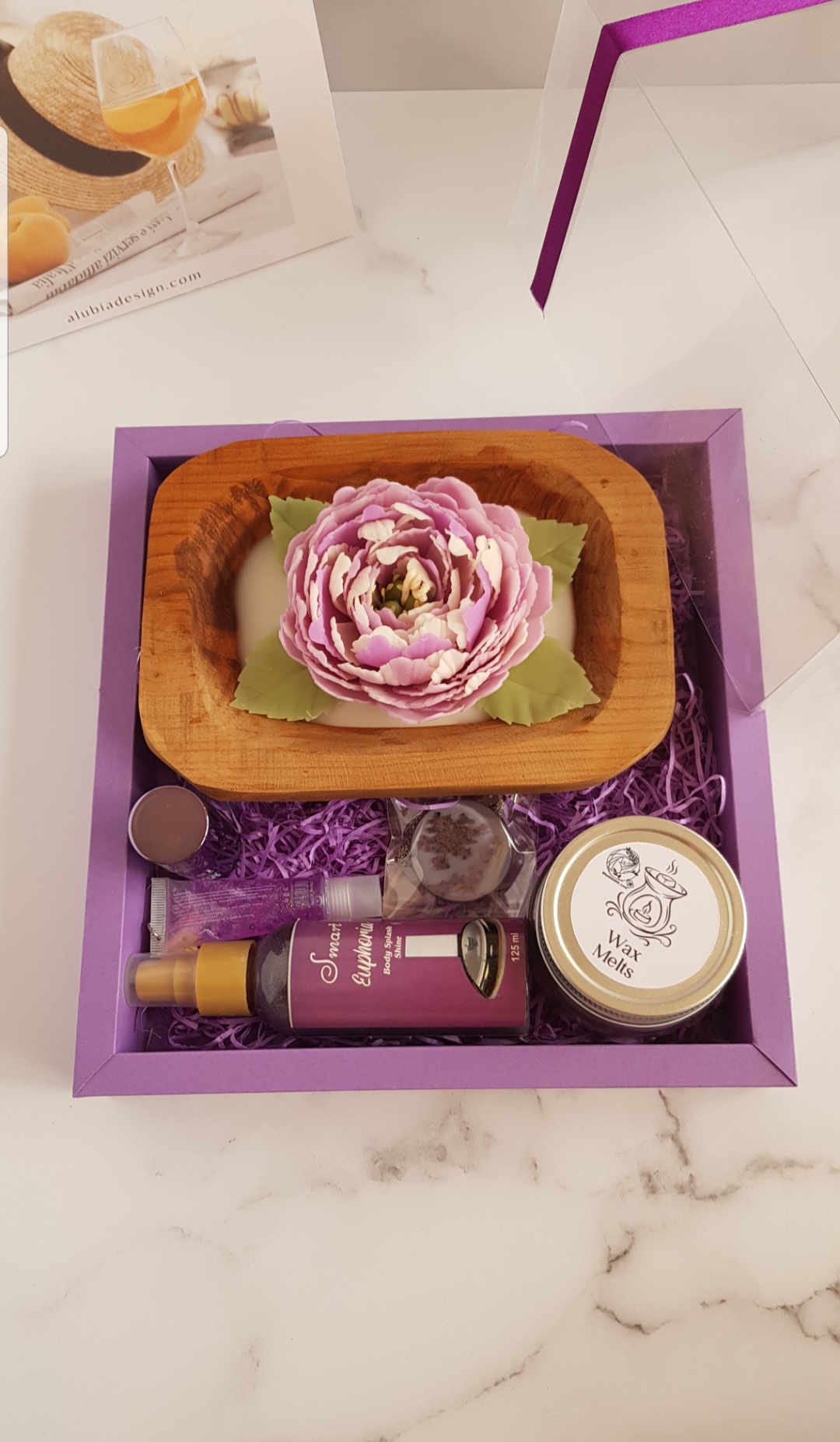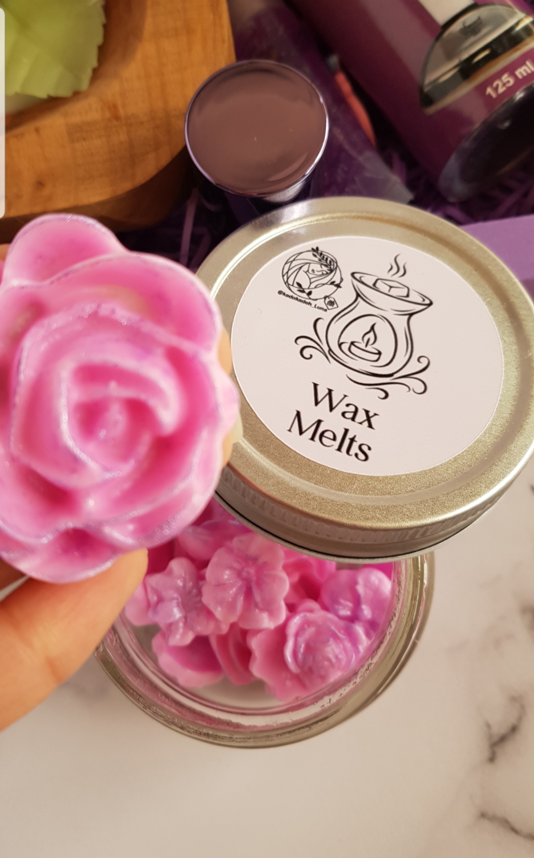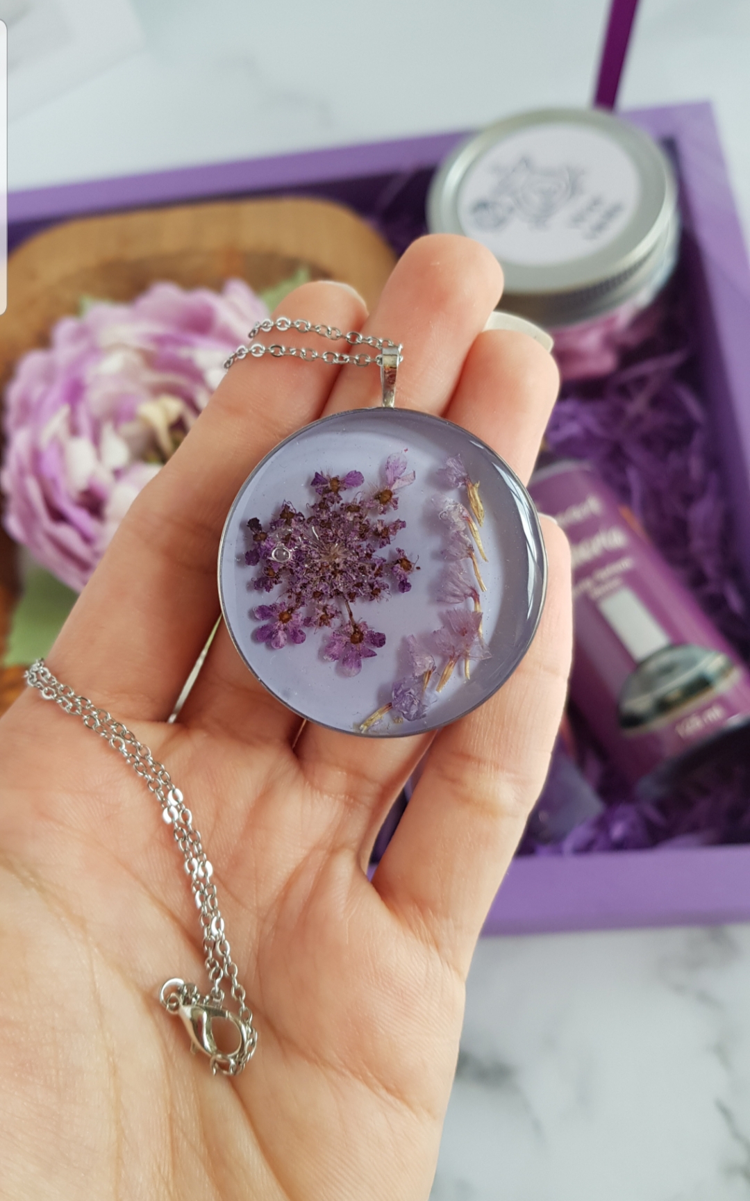 شمع گل پیونی تماما دستساز، لیپ بالم، بادی اسپلش ۱۲۵میل، لاک آینه ای مارک لیزل، گردنبند رزینی صفر تا صد دستساز و هنری با گل های زیبا، وکس ملت گل های یاسی با شاین بنفش