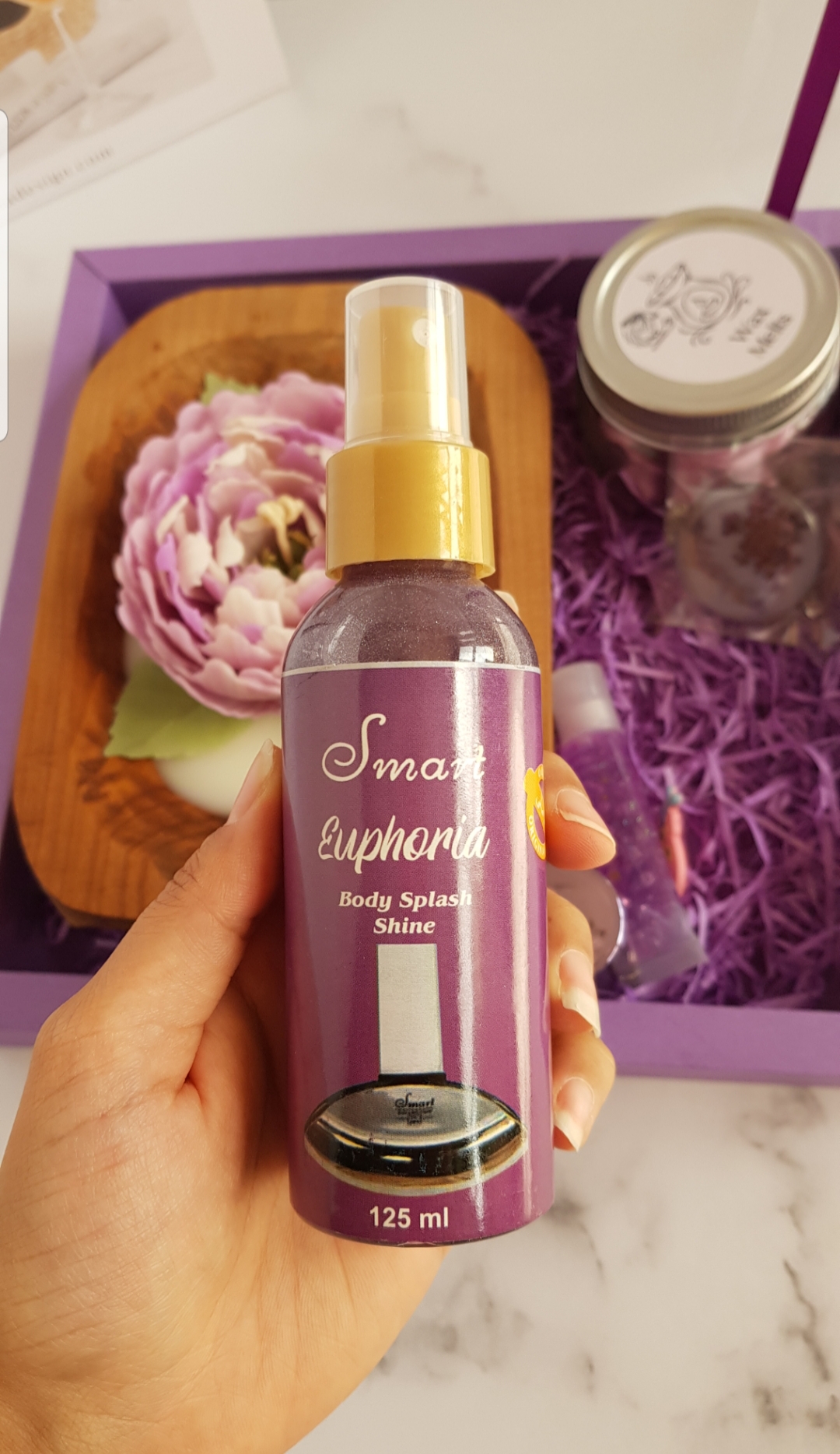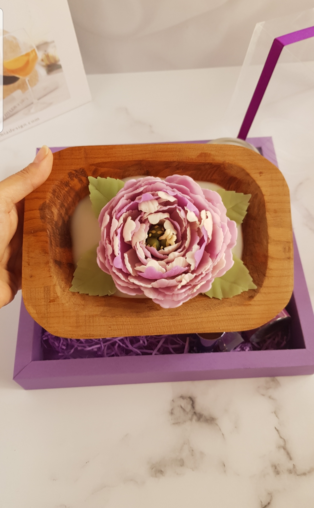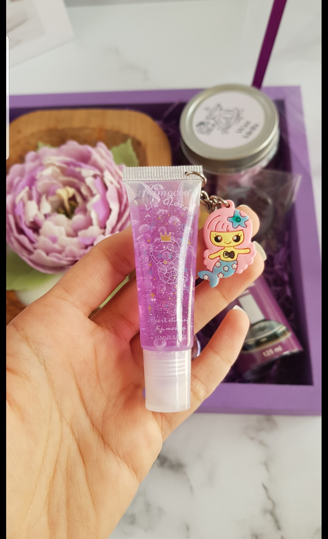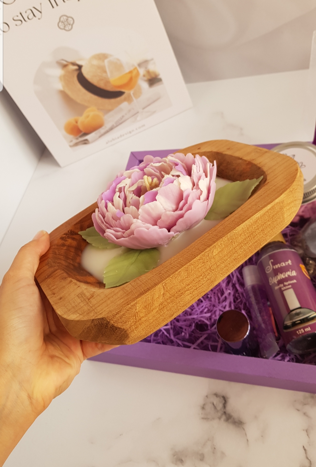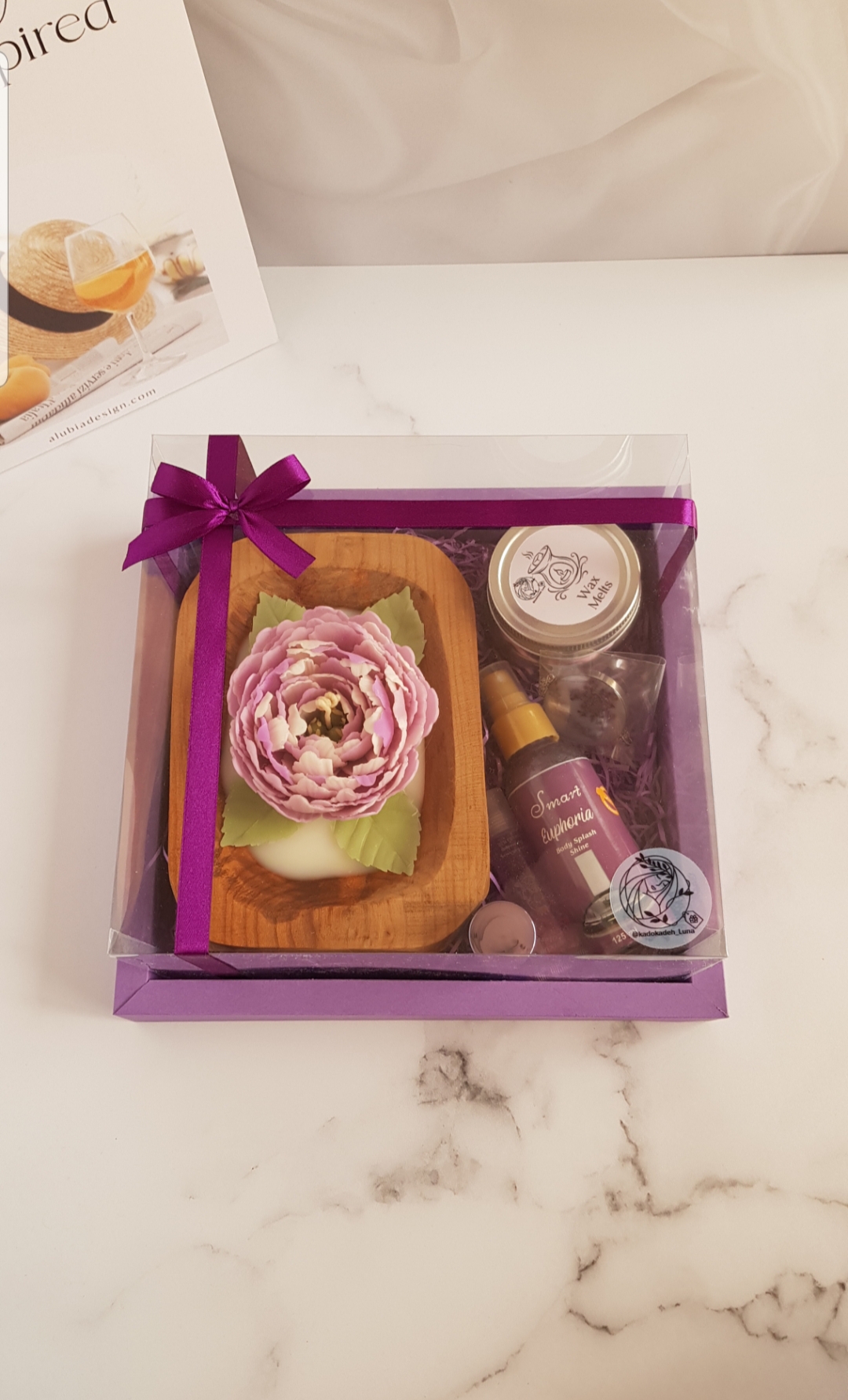شمع گل پیونی تماما دستساز، لیپ بالم، بادی اسپلش ۱۲۵میل، لاک آینه ای مارک لیزل، گردنبند رزینی صفر تا صد دستساز و هنری با گل های زیبا، وکس ملت گل های یاسی با شاین بنفش